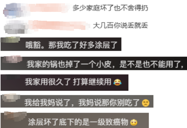 不少网友纷纷吐槽,自己家的不粘锅使用的比较久了,涂层也掉落得厉害。不过,大几百的锅,说扔就扔,还有点舍不得。