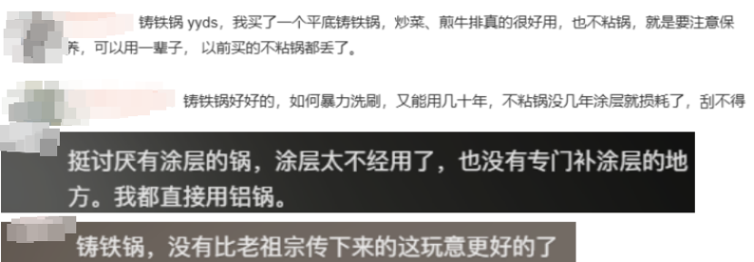 还有一些朋友则强烈推荐铸铁锅,经久耐用,还不用担心涂层脱落的问题。再加上科学的烹饪方式,比如热锅凉油,炒菜也不容易粘锅。日常对锅合理使用及注意养护,一口锅不仅能用上很多年,还特别的健康。